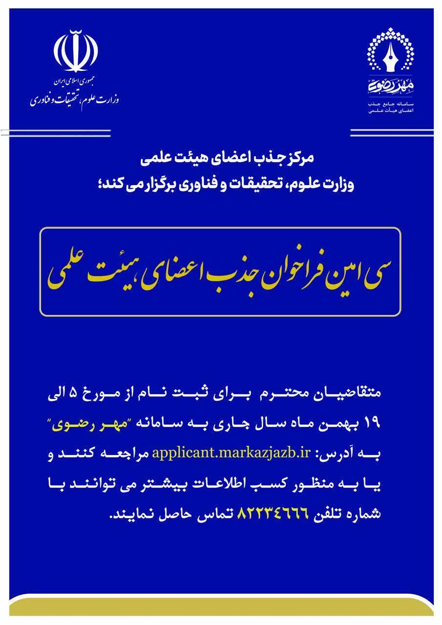 "بنا به اعلام مرکز جذب اعضای هیئت علمی وزارت علوم، تحقیقات و فناوری ثبت‌نام متقاضیان شرکت در فراخوان جذب اعضای هیئت علمی دانشگاه‌ها از ۵ بهمن تا ۱۹ بهمن 1404 صورت می پذیرد.